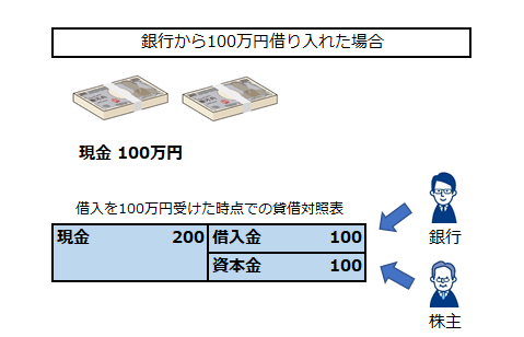 会社を設立した後、銀行から借り入れをした例で考えてみましょう。貸借対照表は以下のようになります。
