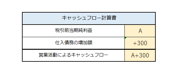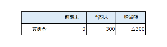 前期末買掛金残高0で当期末の残高が300の例で考えます。この場合今期買掛金が300増加したということになります。