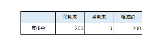 前期末買掛金残高200で当期末の残高が0の例で考えます。この場合今期買掛金が200減少したということになります。